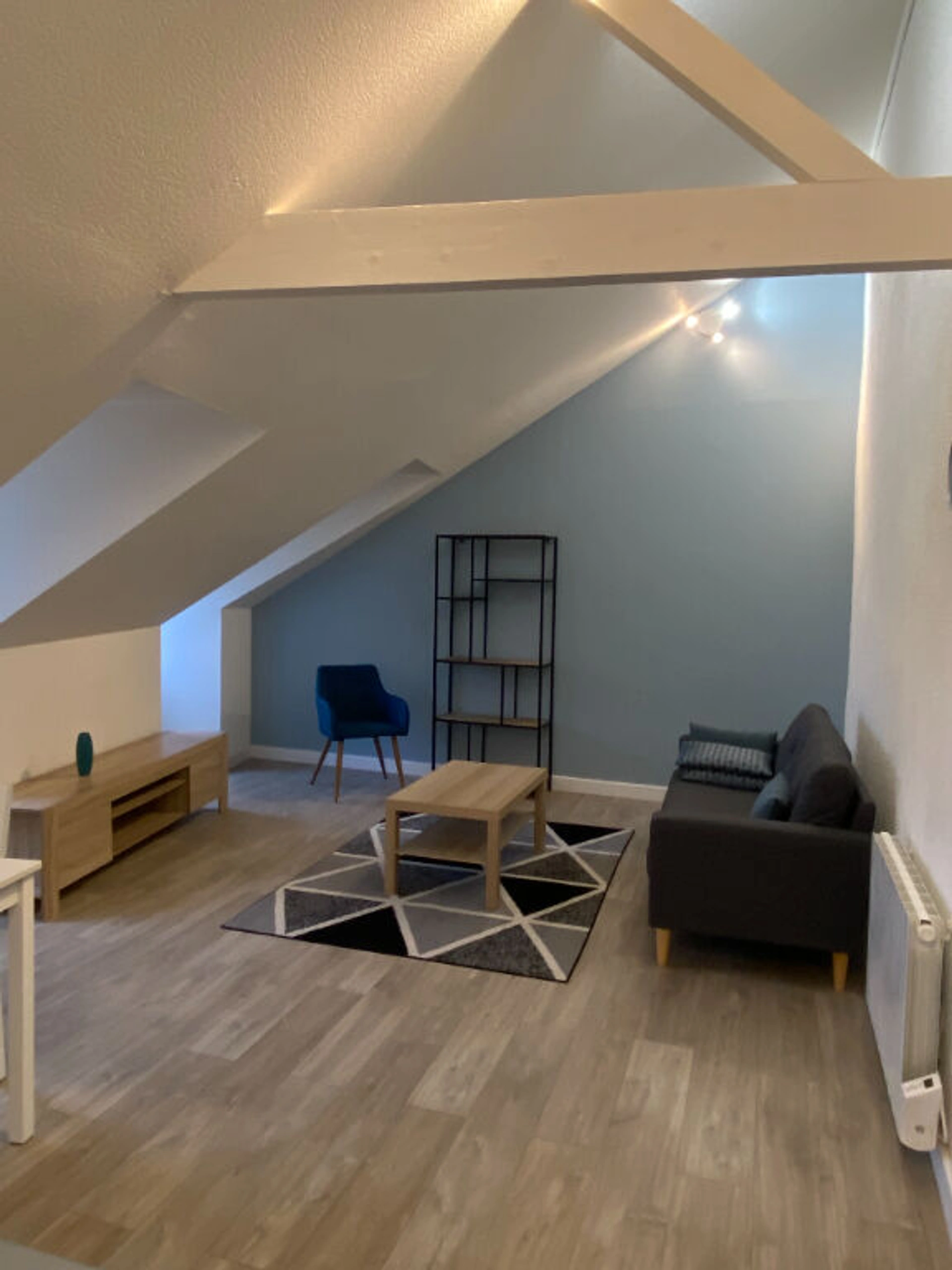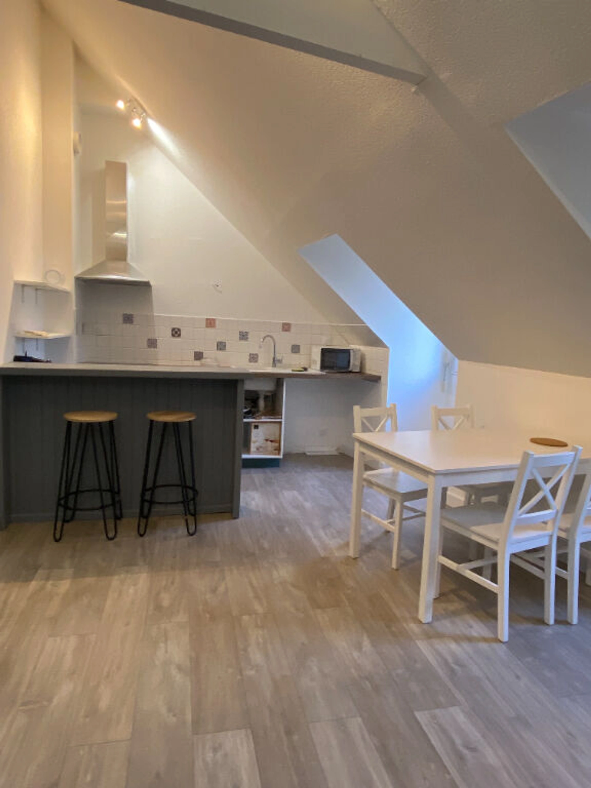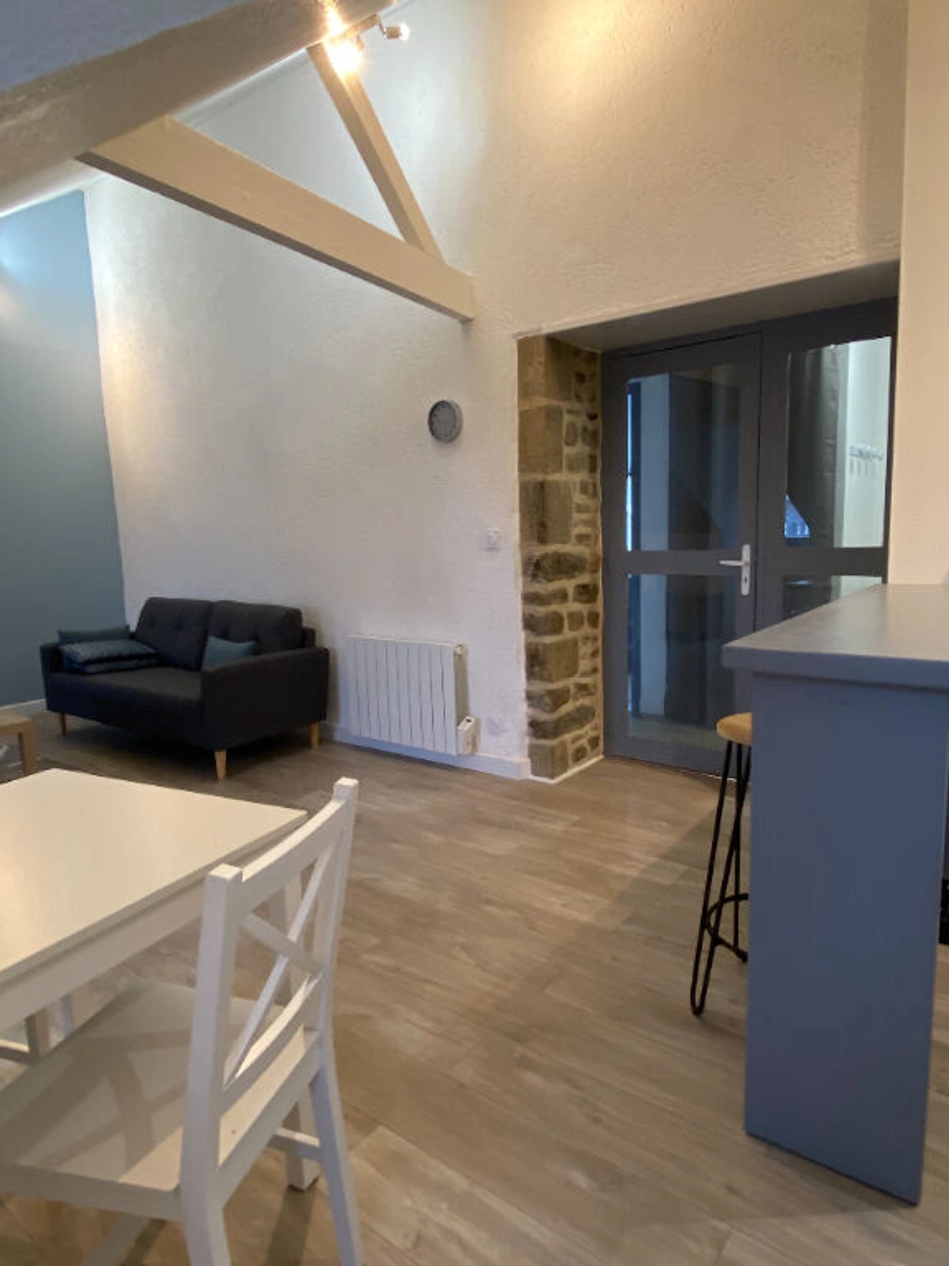 Dans un immeuble de 3 logements, situé dans le coeur historique de St Brieuc, appartement de type 2 rénové avec goût. Il dispose d'une entrée, une pièce de vie avec un espace cuisine, une salle de bain et une chambre. Ce logement a le gros avantage d'être entièrement meublé. Loyers mensuels 500 euros+ 25 euros de charges (communs, provision taxe ordures ménagères). Dépôt de garantie 500 euros. Honoraires d'agence pris en charge par le bailleur. DPE : D