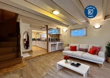 Répartie sur deux niveaux, elle se compose d'une entrée en rez-de-rue avec deux chambres, et en rez-de-jardin, une pièce de vie avec salon-séjour et cuisine aménagée et équipée, ainsi qu'une salle d'eau et un WC séparés.