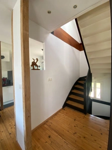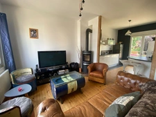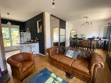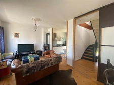 Au premier étage : Pièce de vie traversante avec poêle à bois, cuisine ouverte aménagée et équipée donnant sur terrasse et jardin bien exposé, chambre.