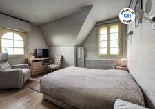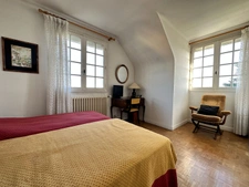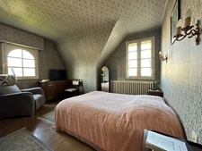 A l'étage, deux grandes chambres, un point d'eau et un WC séparés, ainsi que deux espaces greniers aménageables.