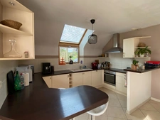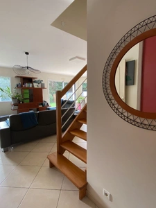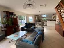 Entrée avec vestiaire, belle pièce de vie de 45 m² composée d'un salon, salle à manger et cuisine ouverte aménagée et équipée, chambre avec placard et salle d'eau aménagée au rez-de-chaussée.