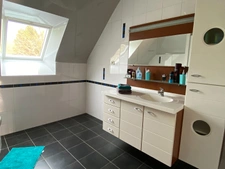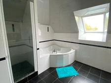 A l'étage : palier, deux chambres, dont une avec placard et l'autre bénéficiant d'une pièce attenante pouvant servir de chambre d'appoint ou bureau/dressing, salle de bains aménagée (douche et baignoire).