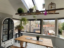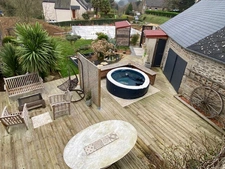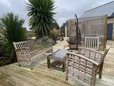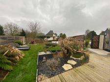 Terrasse et jardin paysagé exposés sud avec abris de jardin.