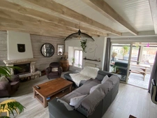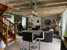 Au rez-de-chaussée : entrée, pièce de vie de 44m² avec cheminée et poutres, cuisine ouverte aménagée et équipée, véranda avec pierres apparentes , chambre avec salle d'eau aménagée privative.